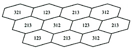 這種組網(wǎng)模式要求主載波異頻配置。輔載波同頻配置?;谥鬏d波與輔載波頻點(diǎn)相異的原則,將剩余的7個(gè)頻點(diǎn)分成兩組。一組用于主載波,一組用于輔載波。為了盡可能地減少主載波上的干擾,原則上考慮將盡量多的異頻頻點(diǎn)分配給主載波。建議主載波組包括4個(gè)頻點(diǎn),其余3個(gè)頻點(diǎn)包含在輔載波組??蓸?gòu)建S4/4/4的蜂窩型網(wǎng)絡(luò)。其主載波的復(fù)用方式如圖3所示,小區(qū)頻率分配情況如圖4所示。