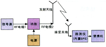 CW測試分為發(fā)射子系統(tǒng)和接收子系統(tǒng),其中,發(fā)射子系統(tǒng)包括發(fā)射天線(推薦使用全向天線)、饋線、高頻信號源、功放、天線支架等;接收子系統(tǒng)包括測試接收機(內(nèi)置GPS)、路測前臺軟件(如Probe)、功率計、筆記本電腦等,系統(tǒng)組成圖如圖2所示。對于中國聯(lián)通,因為其GSM1800頻段與WCDMA頻段較為接近,其無線傳播特性也較為近似,故在時間比較緊迫的情況下,可選擇GSM1800基站作為發(fā)射站點,而不必重新搭建發(fā)射平臺。
