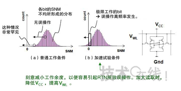 ?。?)以電路水平觀測起因于RTN的誤操作,可以說這是一項對RTN的影響進行評估的基本操作。不過,如果是目有微細化水平的芯片的話,RTN所致誤操作的發(fā)生頻率非常低,很難進行觀測。因此,瑞薩采用了有意減小SRAM的工作余度,提高RTN所致誤操作頻率的方法(圖2)。即加速試驗方法。具體而言,就是通過降低SRAM電源電壓,提高字線電壓,來減少讀取數(shù)據(jù)時的工作余度。通過在這種狀態(tài)下反復讀取數(shù)據(jù),使RTN所致誤操作頻發(fā)。