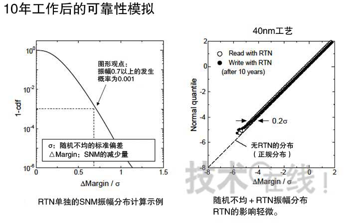 該公司為了獲得SRAM中RTN所致誤操作的發(fā)生概率,對6個晶體管構(gòu)成的組件使用了此次了模擬方法,并根據(jù)結(jié)果算出了作為SRAM工作穩(wěn)定性指標的SNM(Static Noise Margin)的變化量。對40nm工藝SRAM進行該變化量的計算后表明,在該工藝中,與雜質(zhì)不均相比,RTN的影響較為輕微(圖6)。
