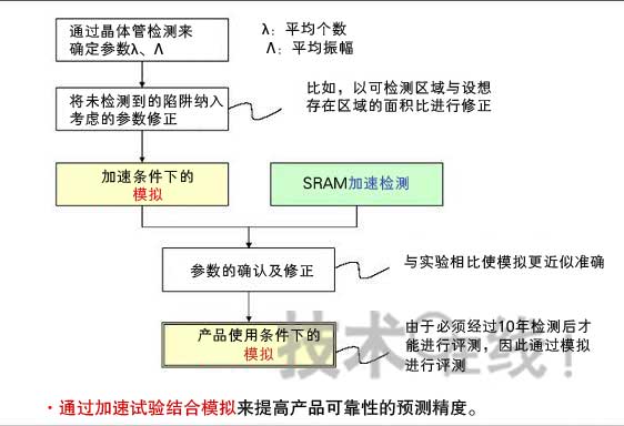 此次該公司以SRAM為對象,開發(fā)了用于分析RTN對電路工作造成的影響,并將分析結(jié)果體現(xiàn)在芯片設計中的方法(圖1)。該方法由三項要素構(gòu)成:(1)對起因于RTN的SRAM誤操作進行觀測,掌握其發(fā)生概率的方法,(2)在實用時間內(nèi)對誤操作發(fā)生的概率進行模擬的方法,(3)使加速試驗的結(jié)果體現(xiàn)在模擬中,以提高精度的方法。此次使通過(2)、(3)方法導出的計算結(jié)果與(1)加速試驗的結(jié)果實現(xiàn)了充分吻合。在這一方面,值得一提的是以下兩點。第一,瑞薩以前一直在探討的RTN分析式在預測起因于RTN的電路誤工作時有效。第二,今后通過提高加速試驗的規(guī)模及精度,并體現(xiàn)其結(jié)果,便有望將模擬精度提高到實用水平。
