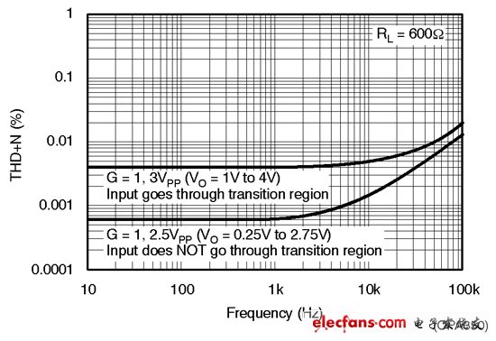 影響雙電源放大器總諧波失真加噪聲(THD+N) 特性的主要因素是輸入噪聲和輸出級(jí)交叉失真。單電源放大器的THD+N性能源于放大器的輸入和輸出級(jí)。然而,輸入級(jí)對(duì)THD+N的影響又讓單電源放大器的這種
