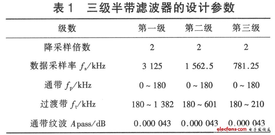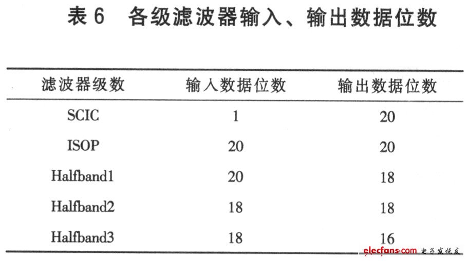 設(shè)計(jì)了采樣頻率為640 MHz、過(guò)采樣率為64的高頻數(shù)字抽取濾波器。該數(shù)字抽取濾波器由CIC(Cascaded Integrator Comb)濾波器(降16倍)、CIC補(bǔ)償濾波器(降2倍)和半帶