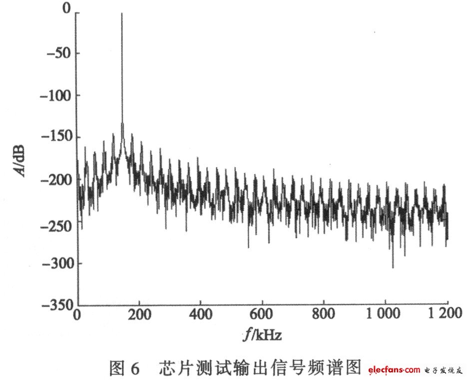 在模擬三階CRFB結(jié)構(gòu)的∑-△調(diào)制器輸入的情況下,通過邏輯分析儀采集輸入為150 kHz正弦信號的輸出數(shù)據(jù),并由計算得到的頻譜如圖6所示,信號與噪聲加失真比(SINAD)大于86 dB,滿足性能指標(biāo)要求。