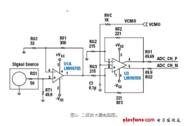 ,在500MHz下能夠提供-50dB THD值的、最小帶寬為1GHz的差分放大器是很適合的。利用可以極大縮短前端設(shè)計(jì)時(shí)間的現(xiàn)成的運(yùn)算放大器元件,可以從高速ADC獲取較好的動(dòng)態(tài)性能。在頻率上限處,放大器