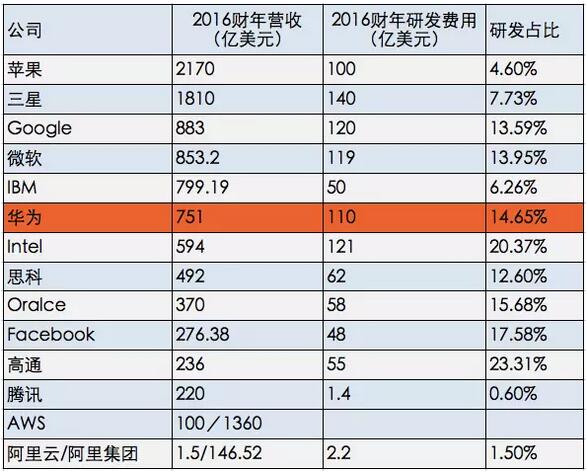 1、卓越的公司,都對研發(fā)重兵投入。從研發(fā)投入在總營收盤子中的占比來看,除了蘋果這個傳奇另當別論,占比較高的高通、Intel、Facebook、Oracle、華為、微軟、Google和思科都是各自所在領(lǐng)域的楚翹,且具有難以替代的競爭力。
