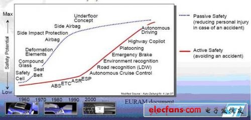 如今,汽車安全系統(tǒng)已從被動形式發(fā)展到主動形式。在傳統(tǒng)的安全帶、安全氣囊等汽車被動安全系統(tǒng)之外,為避免意外事件發(fā)生而開發(fā)的汽車主動安全系統(tǒng),如車輪防抱死制動系