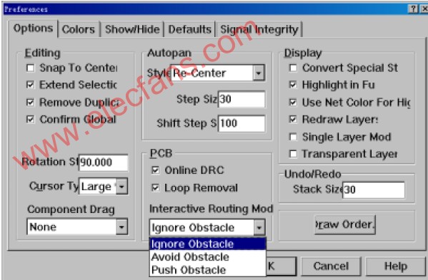 在布線之前先要設(shè)置布線方式和布線規(guī)則。Protel99 SE有三種布線方式:忽略障礙布線(Ignore obstacle),避免障礙布線(Avoid obstacle),推擠布線(Push obstacle)。我們可以根據(jù)需要選用不同的布線方式,在“Tools”工具菜單下選擇“Preferences”優(yōu)選項(xiàng)中選擇不同的布線方式。也可以使用“SHIFT+R”快捷鍵在三種方式之間切換。
