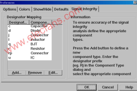 設(shè)置信號(hào)完整性設(shè)計(jì)規(guī)則15打開“LCD Controller.ddb”設(shè)計(jì)數(shù)據(jù)庫,在“Design Explorer 99SEExamples”目錄下,通過左側(cè)的導(dǎo)航樹,打開“LCD Controller.pcb”文件。設(shè)置信號(hào)完整性設(shè)計(jì)規(guī)則,測試的描述。必須包含層堆棧規(guī)則。在“Tools”下選擇“Preferences”對話框中的“Signal Integrity”選項(xiàng),在這個(gè)對話框中,顯示了所有元件的標(biāo)號(hào)所代表的元件名稱。例如“ R”代表“Resistors”,用“Add”增加,在“Component Type”對話框上,用“R”設(shè)置“Designator Prefix”,在“Component Type”中設(shè)置為“Resistor”,點(diǎn)擊“OK”加入。