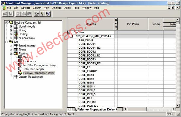 2, 因?yàn)槲覀兡康氖且O(shè)置等長(zhǎng), 所以我們用Relative Propagation Delay這屬性, 從左邊控制欄中選擇Net>Routing>Relative Propagation Delay,
