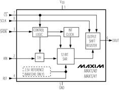 MAX1241是低功耗,12位串行模數(shù)轉(zhuǎn)換器,共有8個(gè)管腳,工作電壓為+2.7~+5.5V,連續(xù)AD轉(zhuǎn)換時(shí)間為7.5μs,跟蹤時(shí)間為1.5μs,片上自備時(shí)鐘及采樣