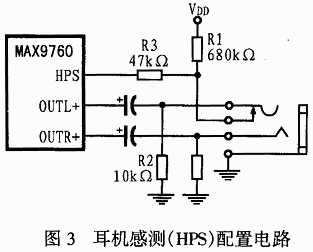 MAX9760的HPS腳可通過HPSD位使能。同時(shí),通過HPSD可使器件在自動檢測模式或固定模式下操作。HPS設(shè)置如表2所列。