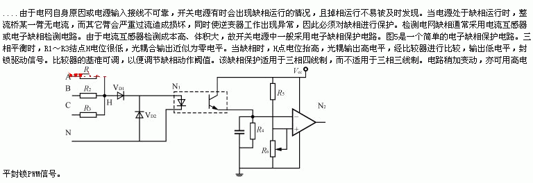 。比較器的基準可調(diào),以便調(diào)節(jié)缺相動作閾值。該缺相保護適用于三相四線制,而不適用于三相三線制。電路稍加變動,亦可用高電平封鎖PWM信號。