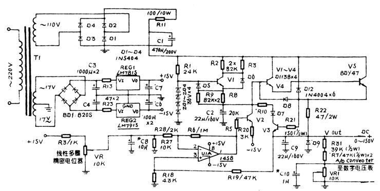,將一般穩(wěn)壓電路中引入一差分電路作穩(wěn)壓電源的取樣比較電路.并對(duì)電路的參數(shù)作了適當(dāng)?shù)恼{(diào)整,使得整個(gè)電源的輸出動(dòng)態(tài)范圍大大改善,其值可達(dá)100V左右。做好的樣機(jī)經(jīng)使用后表明,效果甚佳。其指標(biāo)為: 輸入交流150V~250V,輸出直