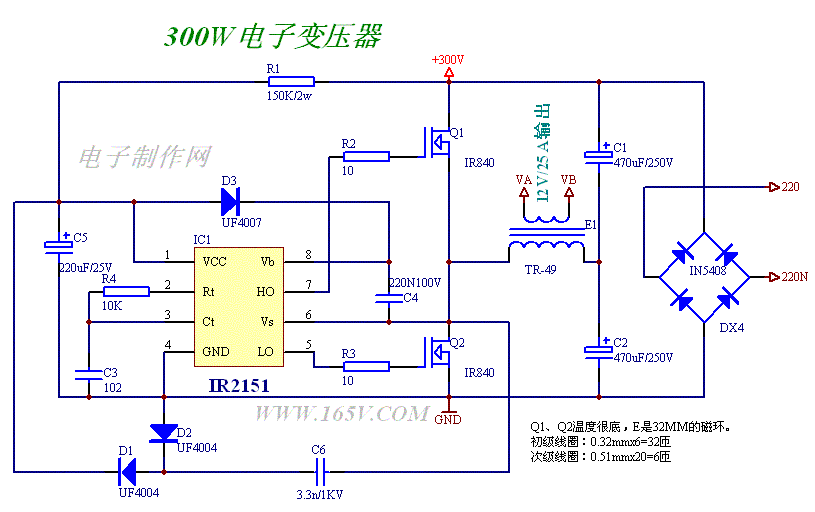 下圖為IR2151的電子變壓器電路,電路簡(jiǎn)單,制作容易,無(wú)須調(diào)試.電路輸出功率達(dá)到300W,如果需要?jiǎng)e規(guī)格的輸出電壓,需要進(jìn)行變壓器設(shè)計(jì),稍微改變壓器的參數(shù),可以做成音響上用的雙電源輸出功放變壓器.