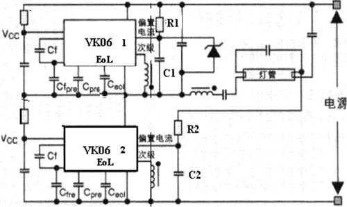 圖2 應用VK06TL驅動電路的一個熒光燈鎮(zhèn)流器專用的驅動器
