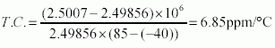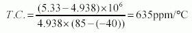 The temperature coefficient was calculated as approximately 10ppm/°C using Equation 1.