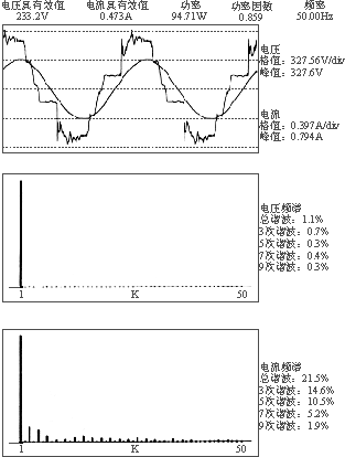 測(cè)量打印的電網(wǎng)輸入波形、電流頻譜(省略了電壓頻譜)