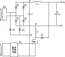 ??? 二次為雙半波整流電路如圖6所示。為分析方便,仍忽略D1,D2,D3的壓降。顯然uAB的波形、S的驅(qū)動(dòng)脈沖波形與圖5完全一致。其工作過程與橋式整流電路相似,在此不再贅述。