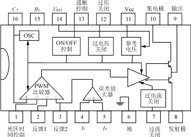 1? 引言 ??? 目前國內(nèi)通信系統(tǒng)中使用的直流變換器以75W半磚型的+5V輸出最為普遍。它以體積小、散熱方便、紋波低、轉(zhuǎn)換效率比較高而得到眾多通信設(shè)備廠家的認同。這里介紹一種用UPC1099脈寬調(diào)制集成電路組成的75W半磚型直流變換電路模塊。它的集成電路性能優(yōu)于其他公司的脈寬調(diào)制器。其外圍元件少、控制靈活、保護功能齊全、性能可靠、應(yīng)用方便,是75W直流變換器最佳選擇方案。 2? UPC1099集成電路內(nèi)部方框圖和引腳功能 ??? 引腳及內(nèi)部方框圖如圖1所示,該電路為16引腳集成電路,各引腳功能如下: