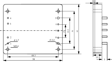 ??? 2)外型尺寸 ??? 外型尺寸61mm×58mm×15.5mm,外形與外形尺寸如圖4及圖5所示。其管腳功能如表3所列。