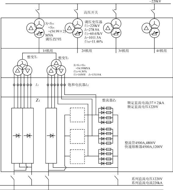 ??? 快速熔斷器在大功率整流器中與整流管或晶閘管串聯(lián)連接,作為對整流器件短路故障的保護(hù)元件。當(dāng)整流器件發(fā)生反向擊穿故障時,快速熔斷器快速分?jǐn)喙收现返亩搪?a href="http://www.greenbey.cn/tags/電流/" target="_blank">電流,保護(hù)整流器免受故障短路電流的危害。 1? 大功率整流器的特點(diǎn) ??? 大功率整流器可以電解鋁用整流器為代表,在我國隨著單個電解槽產(chǎn)量的提高,電解鋁的年產(chǎn)量已由100kt增加到140kt,于是槽電壓已由800V提高到1200V,槽電流已由160kA增至280kA,相應(yīng)的整流變壓器容量已提高到75~100MVA。單臺輸出電流高達(dá)50~75kA的整流器,對整流管、快速熔斷器也提出了更高的技術(shù)要求。 ??? 圖1為年產(chǎn)140kt電解鋁用直流系統(tǒng)圖,它由四組整流機(jī)組并聯(lián)組成,其中一組為備用。每組整流變壓器容量2×54.99MVA,向二臺1220V、37kA整流裝置供電。整流器采用三相橋式同相逆并聯(lián)電路,每橋臂由4只ZP-4800V/4500A整流管并聯(lián)組成,下面討論如何選用合適的快速熔斷器進(jìn)行保護(hù)。