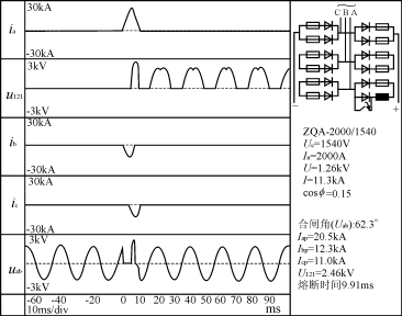 圖2? 模擬整流管擊穿短路時的相關(guān)波形圖 ??? 熔斷器的I2tF值與其設(shè)計(jì)參數(shù),生產(chǎn)工藝有關(guān)。因此,由于生產(chǎn)廠家不同,設(shè)計(jì)參數(shù)不同,生產(chǎn)工藝不同,國內(nèi)外廠家生產(chǎn)的相同額定電壓,額定電流的快速熔斷器,卻有著不同的I2tF值。如西安西整熔斷器廠生產(chǎn)的1000V,6000A快速熔斷器老產(chǎn)品的I2tF值為76×106A2s,而該企業(yè)的新產(chǎn)品RS-1000V/6000AP115SS型快速熔斷器(1000V、6000A)的I2tF值為55×106A2s,二者相差38%。因此,在設(shè)計(jì)大功率整流器時,對于具有相同電壓和電流的快速熔斷器應(yīng)優(yōu)先選用I2tF值較小的。 ??? 按上所述,針對圖1中的大功率整流器選用快速熔斷器時,應(yīng)選用I2tF值為40×106A2s,與ZP?4800V/4500A整流管的I2tD相比,后者I2tD值為30×106A2s,尚小于前者,但相差不大。由于橋臂上有四只整流管并聯(lián)工作,這樣選用快速熔斷器是合理的,并且是可靠的。 2.4? 分?jǐn)嗄芰Φ暮怂? ??? 大功率整流器的整流變壓器容量大,當(dāng)變壓器閥側(cè)橋臂短路時,短路電流相當(dāng)大,整流器或直流電源系統(tǒng)設(shè)計(jì)時應(yīng)計(jì)算橋臂短路電流值與直流側(cè)短路電流值。被選用快速熔斷器的分?jǐn)嗄芰?yīng)大于可能流過故障支路熔斷器的最大短路電流值,否則快速熔斷器在分?jǐn)喽搪冯娏鲿r可能會發(fā)生瓷套炸裂、噴弧、甚至燒損整流器等現(xiàn)象。 ??? 文獻(xiàn)[3]曾對圖1所示整流電路的橋臂短路電流進(jìn)行過計(jì)算,流過橋臂故障整流管的穩(wěn)態(tài)短路電流有效值IbD=186kA,直流側(cè)短路時,短路電流平均值IbDp1=100.12kA。 ??? 在數(shù)臺整流器并聯(lián)的直流電源系統(tǒng)中,對三相橋式電路的橋臂熔斷器核算其分?jǐn)喽搪冯娏髦禃r,可以計(jì)算整流變壓器閥側(cè)短路的穩(wěn)態(tài)電流有效值。但對雙反星型電路的整流器來說,流過故障橋臂熔斷器的短路電流除上述變壓器閥側(cè)短路的交流分量外,尚包含其余并聯(lián)整流器輸入的直流電流分量,這時,快速熔斷器應(yīng)有更高的分?jǐn)嗄芰?。過去國產(chǎn)快速熔斷器的分?jǐn)嗄芰?0、70、100kA數(shù)種,已不能適應(yīng)大功率整流器配套的需要。目前,西安西整熔斷器廠已研制成功RS4(H)系列高分?jǐn)嗄芰Φ目焖偃蹟嗥鳎?jīng)國際著名試驗(yàn)站試驗(yàn),其分?jǐn)嗄芰_(dá)到230kA(有效值),可滿足大功率整流器配套的需要。 2.5? 燃弧峰值電壓 ??? 快速熔斷器分?jǐn)鄷r,其斷口產(chǎn)生的過電壓為熔斷器工作電壓的2~2.5倍,為此要防止正常的半導(dǎo)體器件受到損害。 3? 結(jié)語 ??? 快速熔斷器的選型應(yīng)綜合考慮額定電壓UNF、額定電流INF、最大熔斷I2t值、分?jǐn)嗄芰Φ葏?shù),以做出最佳選擇。 |
