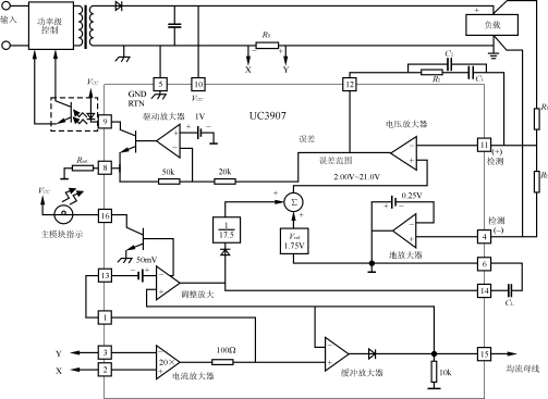 UC3907根據(jù)對模塊電流的監(jiān)控,由均流母線電壓來確定哪一個模塊的輸出電流最大,就指定它為主模塊,而其余的模塊則被認(rèn)為是從模塊,從模塊的電流跟隨主模塊的輸出電流。UC3907實(shí)現(xiàn)