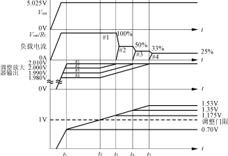 圖3UC3907的結(jié)構(gòu)圖 3UC3907結(jié)構(gòu) UC3907的結(jié)構(gòu)如圖3所示。 由圖3可知,UC3907從結(jié)構(gòu)上可以分為電壓環(huán)和電流環(huán)兩部分。電壓環(huán)由電壓放大器、地放大器和驅(qū)動放大器構(gòu)成;電流環(huán)由電流放大器、調(diào)整放大器、緩沖放大器和狀態(tài)指示構(gòu)成。 3?1電壓環(huán) (1)電壓放大器 電壓放大器是作模塊輸出電壓調(diào)整的反饋控制級,整個電壓回路補(bǔ)償通常就連在該放大器上。輸出偏差限定在2V,以提高系統(tǒng)的大信號響應(yīng)。在檢測中電壓放大器和地放大器配合,電壓放大器完成高阻抗正極性測試,地放大器完成高阻抗負(fù)極性測試。 (2)地放大器 地放大器是一個具有-0.25V偏置的單位增益緩沖器。在保持負(fù)極性輸入端高阻抗時(該端被認(rèn)為是“真的地”—4腳),該偏置使放大器有足夠的負(fù)電壓來提供所有的控制偏置和工作電流。地放大器的輸出(6腳)是模擬地。0.25V的偏置加到1.75V的參考電壓以在電壓放大器正輸入端得到2V的參考電壓,微調(diào)±1.25%。 地返回端(5腳)能得到最大負(fù)電壓,并且比負(fù)極性測試輸入端(4腳)低0到5V。所有芯片電流通過該管腳返回芯片。 (3)驅(qū)動放大器 驅(qū)動放大器是增益為-2.5的反置放大器,它將反饋信號耦合到功率控制器。電流設(shè)定電阻Rset用來建立控制環(huán)的前饋轉(zhuǎn)換功能和最大驅(qū)動電流。驅(qū)動放大器的極性這樣來設(shè)定:在正檢測輸入端(11腳)電壓的升高,光耦電流增加,原邊PWM的占空比減少。這將保證正確的啟動,因?yàn)樵陔娫撮_機(jī)時副邊沒有能量。 驅(qū)動放大器將電壓放大器的輸出轉(zhuǎn)換為誤差電流,提供給光耦。誤差電流IOPO為:IOPO= 式中:Ve為電壓放大器的輸出。 電壓誤差和小信號的增益為: 3?2電流環(huán) (1)電流放大器和緩沖放大器 芯片的均流部分使用了電流放大器、緩沖放大器和調(diào)整放大器。電流放大器的輸出是代表了負(fù)載電流的模擬信號(VCA=20×RS×IOUT),電流放大器的輸出連到驅(qū)動均流母線的單向緩沖器。因?yàn)榫彌_器只提供電流,這保證了最大電流的模塊成為主模塊,并通過低阻抗驅(qū)動均流母線,所有其它模塊的緩沖放大器由10k阻抗到地而無效。 (2)調(diào)整放大器 調(diào)整放大器將模塊自身的負(fù)載電流和最大模塊電流相比較,以調(diào)整模塊電壓放大器的參考電壓來保持均流。調(diào)整放大器是一種跨導(dǎo)型的放大器以限定帶寬,防止噪聲進(jìn)入?yún)⒖茧妷赫{(diào)整電路。調(diào)整放大器的輸出(14腳)通過一個補(bǔ)償電容到模擬地(6腳)。地參考補(bǔ)償類似于內(nèi)部補(bǔ)償,但沒有正信號的問題,因此輸入端濾去了不需要的噪聲。調(diào)整放大器在反向輸入端有一個內(nèi)置50mV的偏置,它使模塊作為主模塊時產(chǎn)生低輸出,不產(chǎn)生調(diào)整指令。當(dāng)50mV的偏置代表了均流誤差,電流放大器將通過檢測電阻將其減少到2.5mV。這使所有的從模塊均流,而主模塊運(yùn)行值稍高于從模塊。這個偏置也抑制了循環(huán)和低頻噪聲爭奪主模塊的位置。 (3)狀態(tài)指示 狀態(tài)指示腳用來指示哪個模塊是主模塊。當(dāng)調(diào)整放大器的輸出為低,集電極觸發(fā)。當(dāng)并聯(lián)模塊中一個模塊過流,該引腳將指示電流最大的模塊幫助診斷出錯模塊。零電流或低電流錯誤對其他模塊沒有影響,并且對電壓控制和均流沒有影響。 4并聯(lián)模塊的啟動 模塊并聯(lián)時必須考慮啟動狀態(tài),4個5V電源模塊并聯(lián)的啟動時序圖如圖4所示,一旦原邊提供功率,功率級將需要最大占空比直到單模塊反饋信號控制輸出電壓。在時間t1,模塊#1由于電流最大成為主模塊,這使輸出電壓高于其他模塊。其他模塊將反饋零占空比信號到功率級,并保持空閑狀態(tài)。在這一點(diǎn)主模塊提供所有的負(fù)荷電流,并且在均流母線上輸出響應(yīng)電流。其它模塊的調(diào)節(jié)放大器檢測到其負(fù)載電流和主模塊電流的差異,開始轉(zhuǎn)換調(diào)節(jié)放大器的輸出來提高電壓放大器的參考電壓。同時主模塊的調(diào)整放大器輸出保持鉗位在低于調(diào)整門限,從而保持原參考電壓不變。在時間t2,其他的三個調(diào)整放大器超過調(diào)整門限,開始改變參考電壓。在時間t3,模塊#2的參考電壓最接近主模塊,并且負(fù)載電流在這兩個模塊間均分。另外兩個模塊#3和#4依然在調(diào)節(jié)參考值。在時間t4,模塊#3取得理想電壓,負(fù)載電流在這三個模塊間均分。在時間t5,最后一個模塊完成了參考值調(diào)節(jié),因此電流均分。如果需要模塊電流緩慢建立,可在控制芯片上設(shè)置啟動時間比調(diào)整時間慢很多的軟啟動。從t1到t5的調(diào)整時間t為:t=,CI= 式中:gm的典型值為3; f為調(diào)整放大器的單位增益頻率; CI為調(diào)整放大器補(bǔ)償電容; Va為調(diào)整放大器偏差; I為調(diào)整放大器最大電流(220μA)。 為了限制電流環(huán)的帶寬,調(diào)整放大器需連電容CI補(bǔ)償。若所需調(diào)整放大器的帶寬為500Hz,CI為1μF。最低參考電壓時,調(diào)整放大器輸出為: =30mV×17.5+1 =15.3V 5電壓環(huán)和均流環(huán)設(shè)計(jì) 均流系統(tǒng)包括兩個環(huán)路:電壓環(huán)和均流環(huán)。電壓環(huán)調(diào)整輸出電壓,并且為了有良好