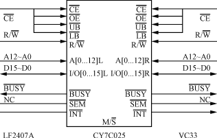 圖2??? 雙DSP系統(tǒng)結(jié)構(gòu)框圖 ??? 電機由IPM來驅(qū)動,霍爾元件檢測相關(guān)物理量,通過信號調(diào)理電路給A/D轉(zhuǎn)換器,轉(zhuǎn)換結(jié)果由LF2407A存儲于雙口RAM中,并由VC33讀取用于計算。調(diào)理的同時保護電路也進行相應的檢測,在意外狀況發(fā)生時隨時切斷觸發(fā)信號。VC33將獲取的數(shù)據(jù)進行分析和計算,所有的數(shù)據(jù)處理都由VC33完成,只將計算結(jié)果反饋給LF2407A,并由此產(chǎn)生相應的控制信號,通過接口電路來控制IPM工作。同時預留了D/A及串口輸出等相關(guān)外圍電路,用于實現(xiàn)顯示、檢測、與其它系統(tǒng)通信等各項功能。LF2407A和VC33優(yōu)勢互補,并行工作,控制周期的長短主要取決于算法實現(xiàn)時間。原有的控制軟件(以C32為控制平臺)需要100μs左右,在采用了新的控制平臺后,整個控制周期減小到20μs左右。 2??? 雙端口RAM存儲爭用解決方案 ??? 在雙機的數(shù)據(jù)交流過程中,存在存儲空間爭用問題,常見的解決方案有如下幾種。 ??? ——硬件方案??? 最簡單的方法就是上面提到的使用雙口RAM內(nèi)部的仲裁邏輯,要求兩邊的CPU都具有RDY引腳,從而插入相應的等待周期。對于8098單片機,DSP都具有這樣的資源,而且只需要硬件支持,相對簡單。如果不具備RDY引腳,如8031單片機,則不能采用此種方法。 ??? ——中斷方案??? 需要硬件和軟件的同時支持。將雙口RAM的左右中斷信號輸出引腳和CPU的外部中斷輸入引腳相連,并編寫相應的中斷子程序。 ??? ——旗語方案??? 同樣需要硬件和軟件的同時支持,我們也稱之為軟件仲裁。其步驟為申請獨占區(qū)域、判斷申請是否成功、釋放獨占區(qū)域。由于兩邊不同時使用同一地址,所以也可以避免爭用的發(fā)生。 ??? 本系統(tǒng)設計時綜合了各種情況最后選用了硬件方案。這是因為使用中斷方案軟件編寫復雜,頻繁中斷跳轉(zhuǎn)在算法和控制都較復雜的情況下,對于軟件的可靠性和穩(wěn)定性是不利的;采用旗語方案則控制相對復雜一些;硬件方案具有簡單可靠的特點,存儲空間的爭用完全由硬件解決,即當發(fā)生存儲空間爭用的時候,決定先行穩(wěn)定的端口優(yōu)先進行訪問,另一端口則插入等待周期。由于DSP的快速性,不同于以往的單片機將產(chǎn)生很長的等待周期。針對本系統(tǒng)考慮,即使是最壞的情況:每個控制周期內(nèi)傳遞數(shù)據(jù)8個,LF2407A一次讀/寫周期50ns記,共需要0.4μs。當然這完全由硬件來實現(xiàn),若考慮軟件上共同配合,則可以更有效地減少等待時間。而且0.4μs和20μs的控制周期相比,所占的比重非常小,并不會給系統(tǒng)性能帶來顯著影響,系統(tǒng)可靠性和穩(wěn)定性也能夠得到保證。這也正是本系統(tǒng)的特點所在。 3??? TMS320C2407A/TMS320VC33與CY7C025之間通信的實現(xiàn) ??? LF2407A的數(shù)據(jù)總線寬度和地址總線寬度都是16位,單片CY7C025就足夠了。VC33的數(shù)據(jù)總線寬度是32位,可以采用兩片CY7C025以主從模式進行寬度擴展(見圖3),這樣每次VC33讀取數(shù)據(jù)時就能一次讀入兩個LF2407A的采樣數(shù)據(jù)。也可以采用單片CY7C025,雖然沒有完全利用VC33的數(shù)據(jù)寬度,但是,從電路設計上來講相對簡潔。由于本系統(tǒng)雙口RAM的作用主要是起到數(shù)據(jù)傳遞的作用,不需要保存大量的中間結(jié)果以及已經(jīng)使用過的數(shù)據(jù),因此,需要的存儲空間不是很大,單片雙口RAM就已經(jīng)足夠。具體的接口電路見圖3,片選等控制信號由譯碼電路產(chǎn)生。