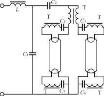 圖7??? 雙燈串聯(lián)燈絲電壓預熱型 3.4??? 雙燈串聯(lián)燈絲電流預熱型 ??? 雙燈串聯(lián)燈絲電流預熱型電路結構如圖8所示。在這種燈絲預熱電路中,利用和鎮(zhèn)流電容串在一起的一個燈絲變壓器(T2)上的次級電壓實現(xiàn)燈絲預熱。