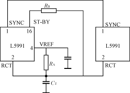 圖3??? EMI共模濾波器 ??? 3)將反激變壓器繞組的饒法改成原—副—原—副—原—副的多層夾層饒法??? 采取該措施后變壓器原副邊的耦合更加緊密,使漏感減小,開關管上電壓尖峰明顯降低。同時共模騷擾源的強度也隨之降低。在不采用解決方案2)時,采用本方案也解決了問題。而且,這種方法從根源上改善了電磁兼容性能,且繞組的趨膚效應和層間效應也都會改善,從而降低了損耗。但是,這種繞法是以犧牲原副邊的絕緣強度為代價的,在原副邊絕緣要求高的場合并不適用。 ??? 4)減慢開關的開通和關斷速度??? 這樣開關管上的電壓尖峰也會降低,也能在一定程度上解決問題。但是,這是以增加開關管的開關損耗為代價的。 ??? 5)開關頻率同步??? 兩路變換器的工作頻率都是100kHz,但是,使用兩個RC振蕩電路,參數上會有離散性,兩個頻率會有一定偏差。這樣兩路電源可能會產生一個拍頻引起振蕩。所以,也嘗試了用一個RC振蕩電路,一個PWM芯片由另一個PWM芯片來同步,這樣可以保證嚴格的同頻和同時開通,對減少兩路電源之間的干擾會有一定好處。在這個電源系統(tǒng)中,采用的PWM芯片是ST公司的L5991芯片,可以非常方便地接成兩路同步的方式,如圖4所示。