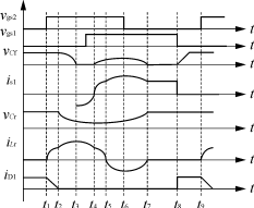 ??? 在分析中的假定與2.2基本相同,并設(shè)初始狀態(tài)為:S及Sa均為關(guān)斷狀態(tài),D處于導(dǎo)通狀態(tài)。iD=iLr=Ii,vCr=Vo,則電路在穩(wěn)態(tài)時,每個開關(guān)周期可劃分為8個模態(tài),相應(yīng)的主要波形如圖9所示。