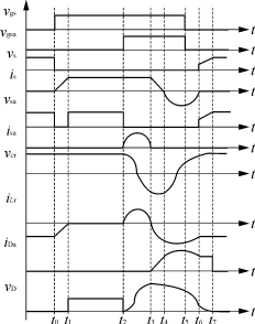 ??? 設(shè)初始狀態(tài)為:S1及S2均為關(guān)斷狀態(tài),輸出整流二極管D處于導(dǎo)通狀態(tài)。is1=0,is2=0,iD=Ii,vCr=Vo,vCB=0。電路在穩(wěn)態(tài)時,每個開關(guān)周期的工作過程可分為7個模態(tài),相應(yīng)的主要波形如圖3所示。