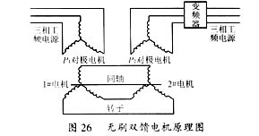 近年來在該原型電機的基礎(chǔ)上研制出的改進型無刷雙饋電機只有一個定子,一個籠形轉(zhuǎn)子,一套公共磁路,定子中有兩套不同極對數(shù)的繞組,一組稱功率繞組,接三相電網(wǎng),另一組稱控制繞組,接變頻裝置。這種電機的原理示于圖27。在兩種繞組極對數(shù)確定的情況下,通過改變控制繞組變頻器的輸出頻率即可實現(xiàn)電機的無級調(diào)速,調(diào)速的范圍與極對數(shù)和二套電源的輸出頻率有關(guān),具體的轉(zhuǎn)速表達式為: