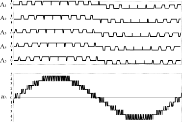 4.2.2? 多電平技術(shù) ??? 我國(guó)標(biāo)準(zhǔn)規(guī)定中壓電壓等級(jí)為6kV和10kV,若直接變頻,即使用4.5kV~6kV耐壓的功率器件,仍需串聯(lián)使用,使器件數(shù)量增加,電路復(fù)雜,成本加大,可靠性大為降低。為了避免功率器件的串、并聯(lián)使用,世界上很多公司致力于開(kāi)發(fā)高耐壓、低損耗、高速度的功率器件。如西門子公司研制的HV-IGBT耐壓可達(dá)4.5kV,ABB公司研制的新型功率器件——集成門極換流晶閘管(IGCT),耐壓可達(dá)6kV,并在致力于研制耐壓9kV的IGCT器件。在研制高耐壓器件的同時(shí),對(duì)變頻器的主電路拓?fù)涞难芯恳灿兴黄疲湫偷睦印嚯娖郊夹g(shù)就是使用有限耐壓的功率器件,直接應(yīng)用于6kV電壓的主電路拓?fù)浼夹g(shù)。圖16是ABB公司ACS1000型12脈波輸入三電平高壓變頻器的主電路結(jié)構(gòu)圖。 ??? 整流部分采用12脈波二極管整流器,逆變部分采用三電平PWM逆變器。由圖16可以看出,該系列變頻器采用傳統(tǒng)的電壓型變頻器結(jié)構(gòu),通過(guò)采用高耐壓的IGCT功率器件,使得器件總數(shù)減少為12個(gè)。隨著器件數(shù)量的減少,成本降低,電路結(jié)構(gòu)簡(jiǎn)潔,從而使體積縮小,可靠性更高。 圖16? 三電平IGCT變頻器主電路結(jié)構(gòu)圖 ??? 若采用6kV耐壓的IGCT,變頻器輸出電壓可達(dá)4.16kV,采用5.5kV耐壓的IGCT,變頻器輸出電壓可達(dá)3?5kV,將Y型接法的6kV中壓電動(dòng)機(jī)改為△接法,剛好適用此電壓等級(jí),同時(shí)也滿足了IGCT電壓型變頻器對(duì)電機(jī)的絕緣等級(jí)提高一級(jí)的要求,因此這個(gè)方案可能是最經(jīng)濟(jì)合理的。若要輸出6kV電壓,還必須進(jìn)行器件串聯(lián)。由于變頻器的整流部分是非線性的,產(chǎn)生的高次諧波將對(duì)電網(wǎng)造成污染。為此,圖16所示的ACS1000系列變頻器的12脈波整流接線圖中,將兩組三相橋式整流電路串聯(lián)起來(lái),整流變壓器初級(jí)繞組接成三角形,次級(jí)繞組一組接成三角形,另一組接成星形,兩個(gè)次級(jí)繞組的線電壓相同,但相位則相差30°,這樣5次、7次諧波在變壓器的初級(jí)將會(huì)有180°的相移,因而能夠互相抵消,同樣的17、19次諧波也會(huì)互相抵消。這樣經(jīng)過(guò)2個(gè)整流橋的串聯(lián)疊加后,即可得到12脈波的整流輸出波形,比6脈波更平滑,并且每個(gè)整流橋的二級(jí)管耐壓可降低一半。采用12相整流電路減少了特征諧波含量,由于N=KP±1(P為整流相數(shù)、K為自然數(shù)、N為特征諧波次數(shù))。所以網(wǎng)側(cè)特征諧波只有11、13、23、25次等。如果采用24脈波整流電路,網(wǎng)側(cè)諧波將更進(jìn)一步被抑制。兩種方案均可使輸入功率因數(shù)在全功率范圍內(nèi)保證在0.95以上,不需要功率因數(shù)補(bǔ)償電容器。 ??? 變頻器的逆變部分采用傳統(tǒng)的三電平方式,所以輸出波形中不可避免地產(chǎn)生比較大的諧波分量,這是三電平逆變方式所固有的。輸出線電壓波形見(jiàn)圖17。因此在變頻器的輸出側(cè)必須配置輸出濾波器才能用于普通的籠型電動(dòng)機(jī)。同樣由于諧波的原因,電動(dòng)機(jī)的功率因數(shù)和效率都會(huì)受到一定的影響,只有在額定工況點(diǎn)才能達(dá)到最佳的工作狀態(tài),隨著轉(zhuǎn)速的降低,功率因數(shù)和效率都會(huì)相應(yīng)降低。 圖17? 三電平PWM變頻器輸出線電壓波形圖 4.2.3? 兩種類型變頻器的性能比較 ??? 現(xiàn)對(duì)多重化變頻器(CSML)和三電平(中性點(diǎn)鉗位)變頻器(NPC)進(jìn)行性能比較,兩種高壓變頻器各有優(yōu)缺點(diǎn),分別體現(xiàn)在以下各方面: ??? 1)器件數(shù)量 ??? 以6kV輸出電壓等級(jí)的變頻器為例,采用NPC方式,逆變器部分需36個(gè)耐壓為3?3kV的高壓IGBT,或者采用24個(gè)耐壓為5kV的IGCT。采用CSML方式,需要15個(gè)功率單元,共計(jì)60個(gè)耐壓為1.7kV的低壓IGBT。從器件的數(shù)量上看,CSML方式要多于NPC方式,但CSML方式采用的是低壓IGBT,相對(duì)于高壓功率器件而言,低壓器件的技術(shù)更加成熟、可靠,成本也較低。 ??? 2)均壓?jiǎn)栴} ??? 均壓?jiǎn)栴}(包括靜態(tài)均壓和動(dòng)態(tài)均壓)是影響高壓變頻器可靠性的重要因素,采用NPC方式,當(dāng)輸出電壓等級(jí)較高(如6kV)時(shí),單用12個(gè)器件不能滿足耐壓要求,必須采用器件直接串聯(lián),器件直接串聯(lián)必然帶來(lái)均壓?jiǎn)栴},失去三電平結(jié)構(gòu)在均壓方面的優(yōu)勢(shì),大大影響系統(tǒng)的可靠性。采用CSML方式,不存在均壓?jiǎn)栴},唯一存在的問(wèn)題是當(dāng)變頻器處于快速制動(dòng)時(shí),電動(dòng)機(jī)處于發(fā)電制動(dòng)狀態(tài),機(jī)械能轉(zhuǎn)化為電能,導(dǎo)致單元內(nèi)直流母線電壓上升,各單元的直流母線電壓上升程度可能存在差異,但這個(gè)問(wèn)題很容易解決,通過(guò)檢測(cè)功率單元直流母線電壓,當(dāng)任何單元的直流母線電壓超過(guò)某一閾值時(shí),自動(dòng)延長(zhǎng)減速時(shí)間,以防止直流母線電壓“泵升”,即所謂的過(guò)電壓失速防止功能,這種技術(shù)在低壓變頻器中被廣泛采用,非常成功。 ??? 3)對(duì)電網(wǎng)的諧波污染和功率因數(shù) ??? 由于CSML方式輸入整流電路的脈波數(shù)超過(guò)NPC方式,前者在輸入諧波方面的優(yōu)勢(shì)是明顯的,因此在綜合功率因數(shù)方面也有一