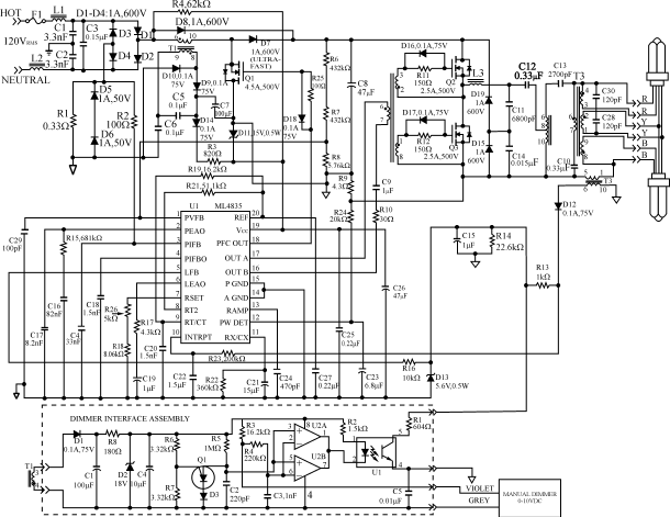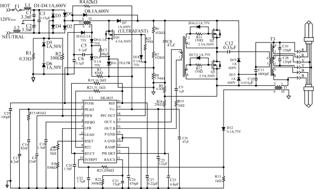 用ML4835設計室內(nèi)可調(diào)光小型熒光燈電子鎮(zhèn)流器