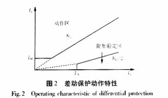 ??? 針對上述情況,變壓器差動保護可以設一個電流互感器TA飽和時的附加穩(wěn)定特性區(qū),它能夠區(qū)分出這種變壓器區(qū)內(nèi)、外故障情況,它的工作特性如圖2所示。