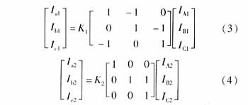 ??? 一般情況下,微機型變壓器差動保護裝置可以采用如下的數(shù)學表達式模擬變壓器各側電流的匹配情況,不再要求電流互感器TA的接線方式。其通常的編程系數(shù)矩陣數(shù)學表達式如下: