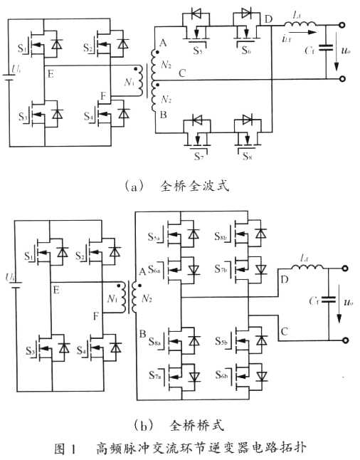 ??? 2)單極性移相控制高頻脈沖交流環(huán)節(jié)逆變器拓撲包括全橋全波式、全橋橋式兩種;