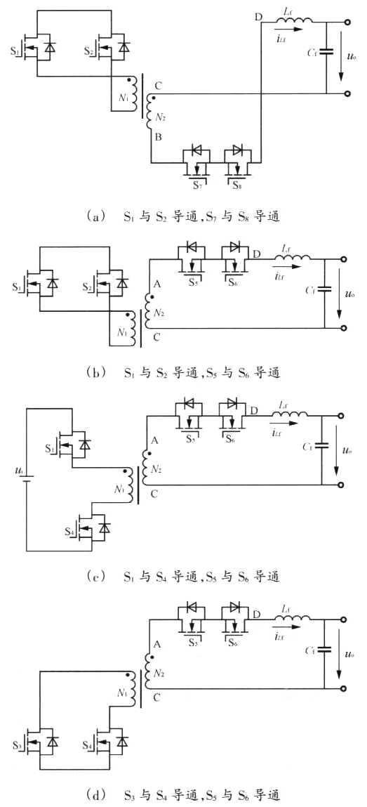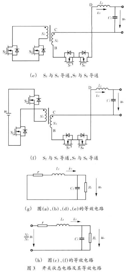 ??? 以輸出電uo>O、濾波電感電流iLf>0為例.穩(wěn)態(tài)工作且輸出濾波電感電流連續(xù)時.一個開關(guān)周期內(nèi)的6個開關(guān)狀態(tài)電路,如圖3(a)~(f)所示.圖3(a)、(b)、(d)、(e)和圖3(c)、(f)可分別用圖3(g)、(h)所示等效電路表示,其中r為包括變壓器繞阻電阻、漏抗、功率開關(guān)通態(tài)電阻、濾波電感寄生電阻等在內(nèi)的等效電阻.由于開關(guān)頻率fs遠大于輸出濾波器截止頻率和輸出電壓的頻率,因此,在一個開關(guān)周期內(nèi)輸出電壓uo可看成恒定量,可用狀態(tài)空間平均法建立輸出電壓、濾波電感電流的定量關(guān)系式.