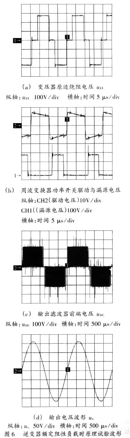 ??? 逆變器額定阻性負載時原理試驗波形,如圖6所示.原理試驗結(jié)果均表明: