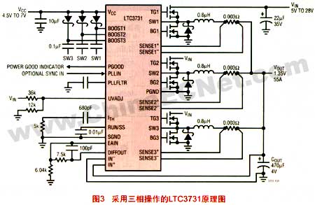 對(duì)于那些對(duì)成本敏感的應(yīng)用或者希望通過(guò)降低最大電流能力來(lái)減小電路板面積的場(chǎng)合,只需去掉其中的一個(gè)或兩個(gè)電感器便可把ltc3425用作一個(gè)兩相或三相轉(zhuǎn)換器。