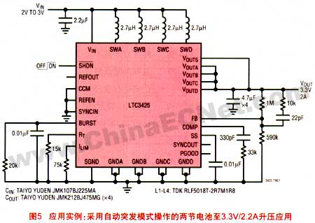 圖5給出了一款采用ltc3425來(lái)實(shí)現(xiàn)從兩節(jié)鎳鎘電池或鎳氫電池至3.3v升壓的典型應(yīng)用電路。該設(shè)計(jì)能夠在每相1mhz的開(kāi)關(guān)頻率條件下以高達(dá)94%的效率來(lái)提供2a以上的負(fù)載電流(4mhz輸出紋波頻率)。最大組件高度僅2.05mm,并在一個(gè)非常寬的負(fù)載范圍內(nèi)保持了高效率。