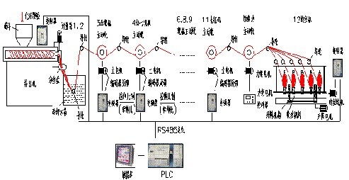 柔性生產(chǎn)線具有配置簡(jiǎn)單,自動(dòng)化程度高,可程序化和重新配置的優(yōu)點(diǎn),而被廣大用戶所采用。化纖柔性生產(chǎn)線中,擠出機(jī)是整個(gè)設(shè)備的重要部分,而后續(xù)各卷繞部分的速度同步才是整個(gè)系統(tǒng)的關(guān)鍵。系統(tǒng)中多電機(jī)速度同步精度的高低,直接影響著化纖絲成品的質(zhì)量。