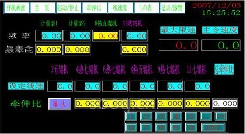 ????????現(xiàn)場(chǎng)操作時(shí),在各級(jí)上有一現(xiàn)場(chǎng)操作箱,可以進(jìn)行速度同升同降,單獨(dú)啟動(dòng)、停止,聯(lián)動(dòng)啟動(dòng)、停止和緊急停止功能,另外在4熱七輥機(jī)和8熱五輥機(jī)的兩個(gè)操作箱上還裝有兩個(gè)線速表,用以顯示當(dāng)前的線速度,便于現(xiàn)場(chǎng)調(diào)節(jié)。集中監(jiān)控時(shí),將控制柜上的選擇開關(guān)撥到觸摸屏端,即可用觸摸屏進(jìn)行啟停操作,但不管集中控制還分散控制,都可在觸摸屏上設(shè)定數(shù)據(jù)和顯示當(dāng)前頻率和電流。