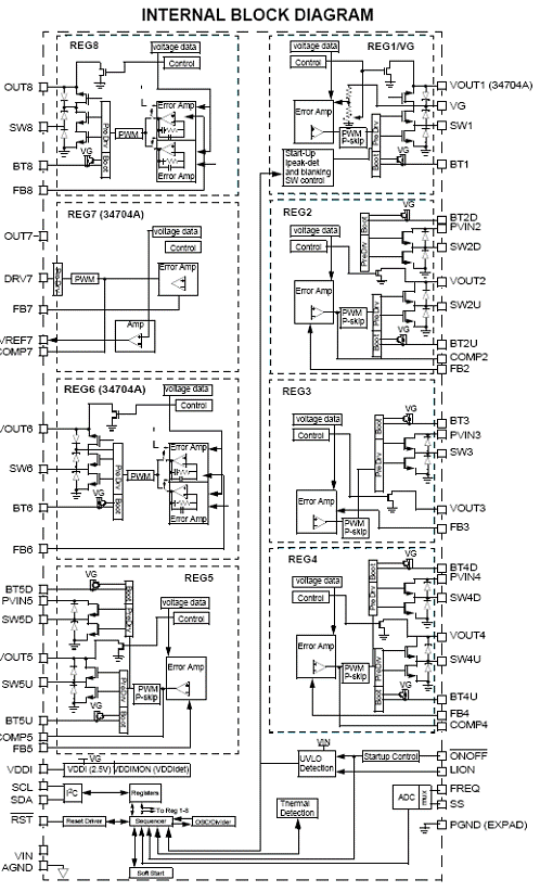 The 34704 is a multi-channel Power Management IC (PMIC) used to address power management needs for various multimedia application microprocessors. Its ability to provide either 5 or 8 independent output voltages with a single input power supply (2.7 and 5.5V) together with its high efficiency, make it ideal for portable devices powered up by Li-Ion/polymer batteries or for USB powered devices as well.