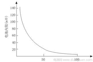 電池內(nèi)電阻會依不同的輸出電流、電池使用次數(shù)、溫度及老化狀況而有不同的數(shù)據(jù),所以可以將電池的內(nèi)電阻當(dāng)做為電池可輸出的容量代表,因電池內(nèi)部的內(nèi)電阻值本身會因上述的因數(shù)來自我修正參數(shù)。因此,內(nèi)阻量測法就是藉由量測電池在充放、電過程中內(nèi)阻的變化,來進(jìn)行預(yù)估電池的殘余電量,如圖8鉛酸電池內(nèi)阻與電量的關(guān)系曲線圖所示。