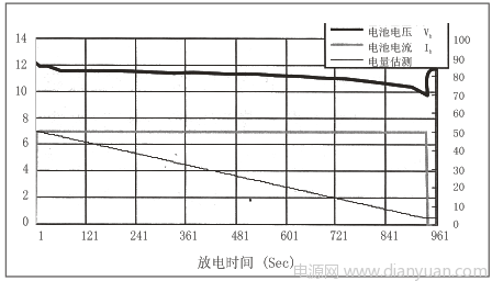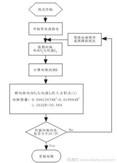 圖5為內(nèi)阻估測法的演算流程圖,其演算核心為數(shù)位單晶片。當(dāng)電量估測法的程式開始執(zhí)行時,先取得電池的端電壓是否大于10.5V,進(jìn)而決定是否要開始進(jìn)行內(nèi)阻偵測,在確認(rèn)無誤后偵測電池是否開始充電或是放電,等到電池有突升或是突降的狀態(tài),利用電流檢測電路與電壓檢測電路將電流與電壓訊號回授至DSP,將電池的端電壓與端電流相除取得其內(nèi)阻值,再利用式(1)取得電池內(nèi)阻與容量的關(guān)系,得知電池的容量為多少,進(jìn)而判斷出電池剩余容量為多少,之后等待下一次電池的突升或突降的狀態(tài),來判斷電池的電流是否做改變進(jìn)而再重新計算出電池殘余電量。本文利用DSP的數(shù)位轉(zhuǎn)類比功能,將估測的電量以LED表示,再以資料收集器記錄其估測電量的輸出變化。在電量計算結(jié)束后,判斷電池電壓是否已經(jīng)低于10.5V的截止放電條件,假設(shè)還未低于10.5V則繼續(xù)進(jìn)行進(jìn)行放電,而且程式也繼續(xù)計算電池的殘余電量,直到電池電壓低于10.5V才停止放電。