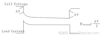 本文內(nèi)阻估測法采用方法為直流量測法,其方法為,在蓄電池流出大量電流的瞬間,此時電池端電壓將會有突降的變化。當(dāng)電池放電結(jié)束時,端電壓將會有突升的情形,此突升、突降的變化斜率與電池內(nèi)阻有密切關(guān)系,如圖2所示[7]。